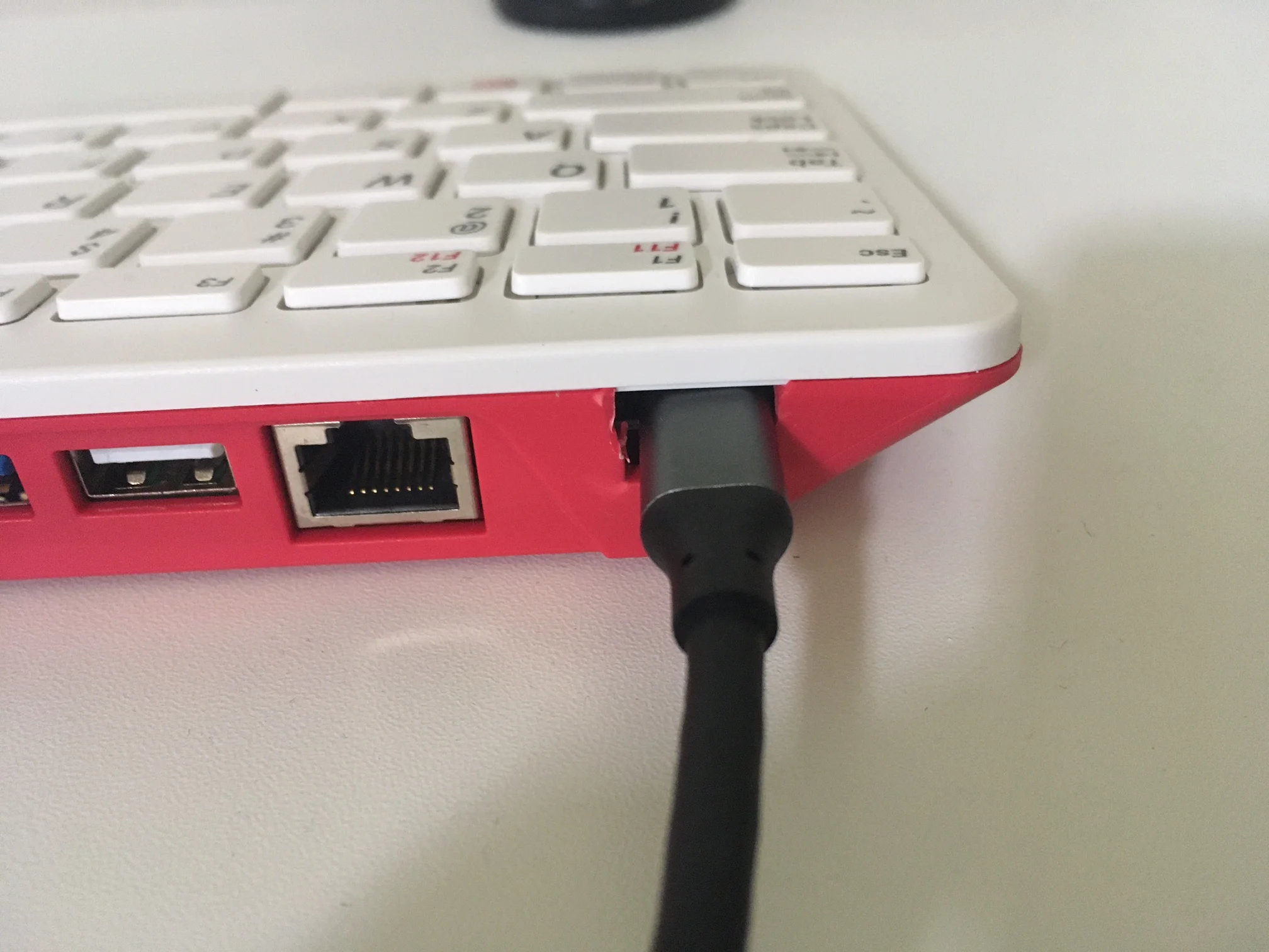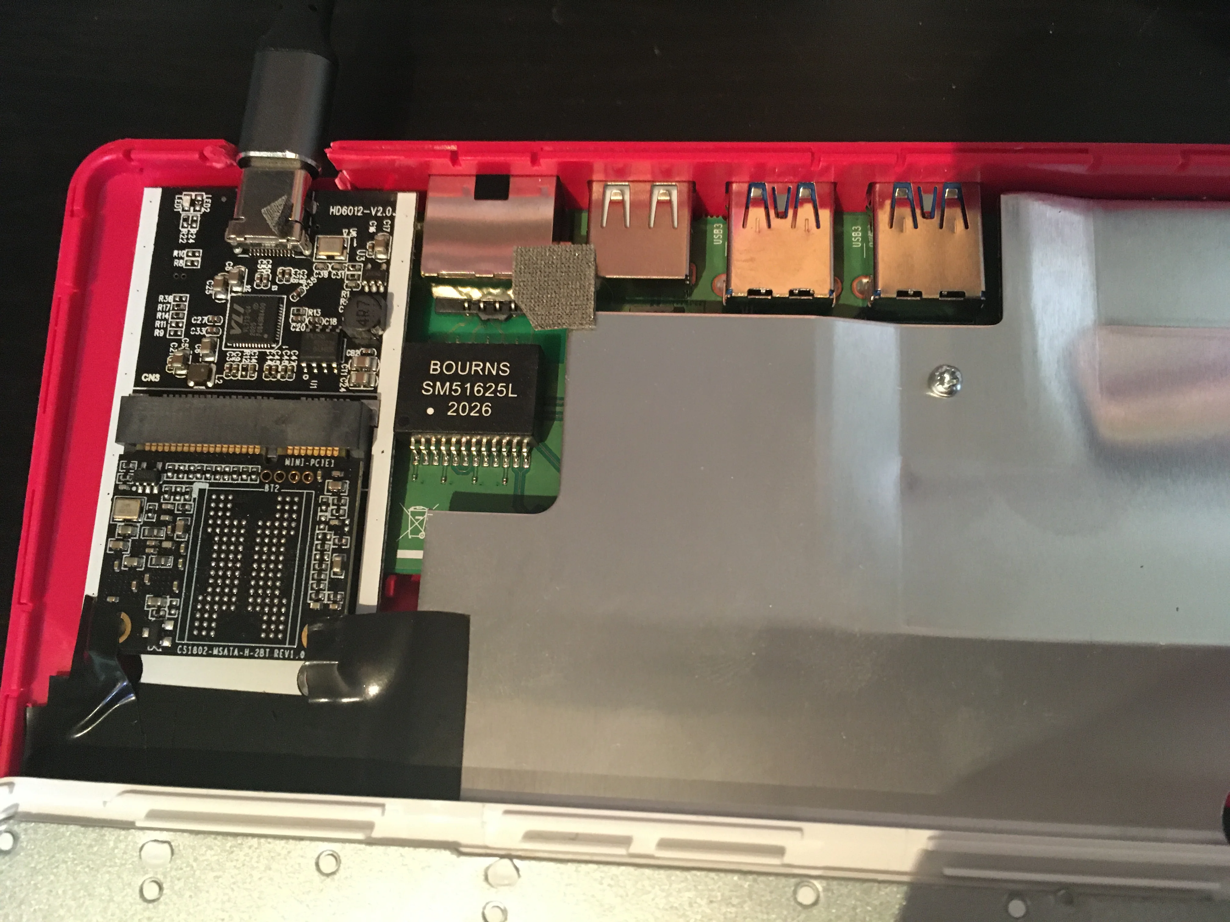 Do you see that ugly black USB-C to USB-A cable jutting out from the top? That little guy connects directly to the mSATA SSD inside the plastic keyboard structure and allows us to boot via USB. It also gives us the flexibility to easily unplug the internal SSD for times when we desire to boot from micro SD or a different USB device altogether.
